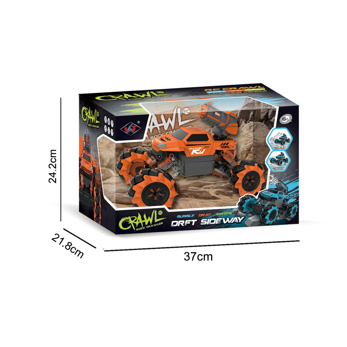 This action packed remote controlled rock crawler has missile launcher for fun shooting action. At the touch of a button you can fire rockets from the rocket launcher at anything in your way. Thanks to its four wheel drive, power suspension, and all-terrain wheels, you can drive it across almost any surface and inclines up to 50°. The wheels also enable you to drift sideways or rotate 360° on the spot. The 2.4GHz remote control has a range up to 30m and is powered by 2 x AA batteries (sold separately). The 4.8V re-chargeable battery onboard the rock crawler can be charged easily by plugging it into an available USB power source. Charging cable included.Â